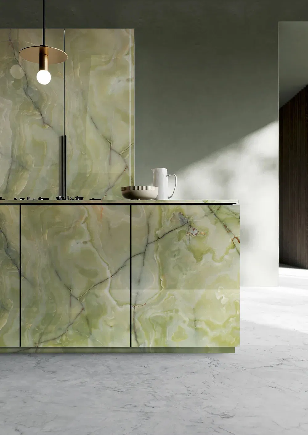 Jade Green Onyx is a wonderful onyx. Translucent color pools with an exquisite flow in this highly prized onyx quarried in Afghanistan. On a ground of shifting. Jade Green Onyx could be used for tub,tub deck, tile,wall panels, countertop, vanity top,fireplace, feature wall, medallion,solid tub,solid sink, moulding,integrated sink,column,sculpture, memorial,mosaic, border, trim, riser, tread, header, sill, threshold,composite panel,laminated panel, balustrade,railing and cut-to-size.